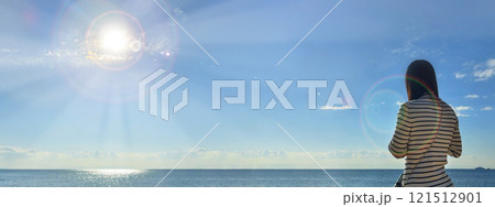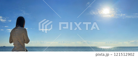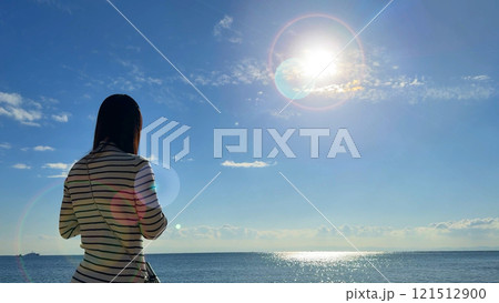 太陽の光を浴びてキラキラと光る海を望む若い女性