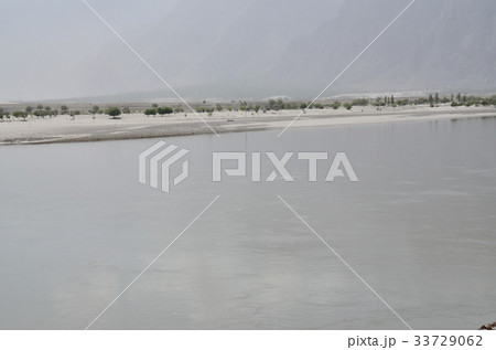 パキスタン スカルドゥ インダス川と野鳥の群れ
