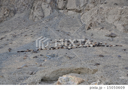 パキスタン スカルドゥ郊外の山 山羊と羊の群れ