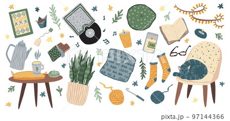 Coffee love. Winter comfort. Hygge collection. Read book. Cat on cozy armchair. Chocolate at home. Autumn tea. Warm drink cup. Pets and clothes. Wool socks. Vector cartoon illustration