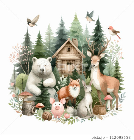 Set of Wild watercolor forest animals. Sticker with woodland wild animals, green trees, berries and plants. Bear, fox, bear, deer, squirrel, owl, hare, hedgehog.