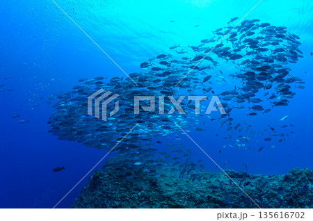 青い海とギンガメアジの群れ パラオの海 ダイビングの風景