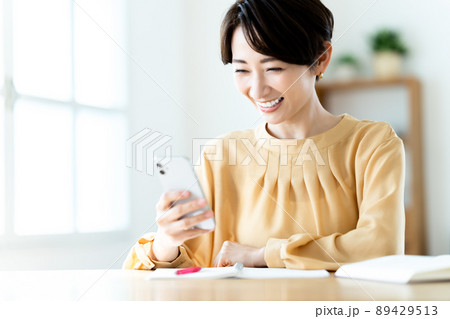 自宅学習中にスマホを使うミドルの女性