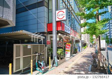 日本の東京都市景観 六本木交差点前から六本木ヒルズやスギ薬局などを望む=5月14日