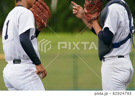 野球の試合中にマウンドに集まるピッチャーとキャッチャー