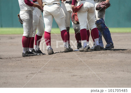 野球の試合中にピンチをむかえマウンドに集まり話し合う内野手たち