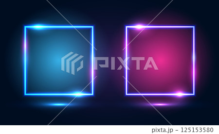 A set of square neon frames with shining effects, highlights and inscriptions on a dark blue background.