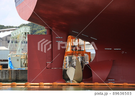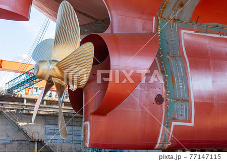 造船所の新造船、船尾(舵とスクリュー)部分のアップ