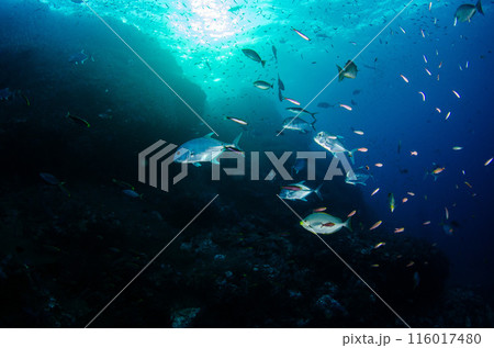 迫力あるタイワンカマス(カマス科)他の群れ。静岡県伊豆半島賀茂郡南伊豆町中木ヒリゾ浜2024年