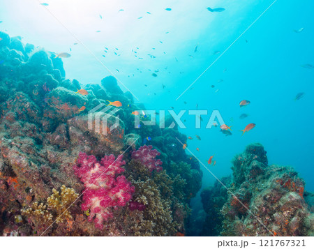 美しいアカハタ、ソラスズメダイ他の群れウミトサカ、イボヤギ他のソフトコーラルが群生する岩礁 ヒリゾ浜
