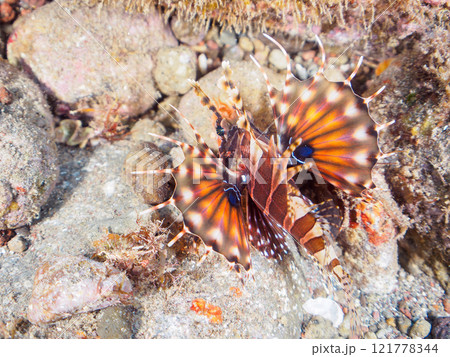 広げた羽根が美しいキリンミノ(フサカサゴ科)の幼魚。静岡県伊豆半島賀茂郡南伊豆町中木ヒリゾ浜2024
