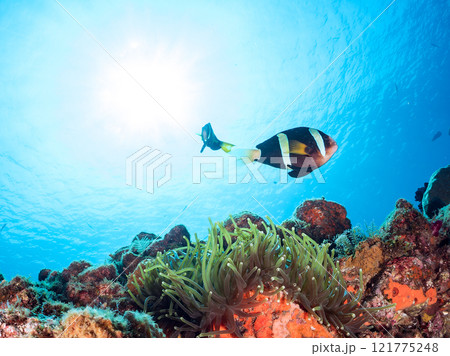 美しいイソギンチャク畑の可愛いクマノミ(クマノミ亜科)の幼魚。 伊豆半島賀茂郡南伊豆町中木ヒリゾ浜