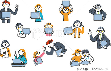 タブレットを手に持つ様々な人々 セットのストックイラスト素材