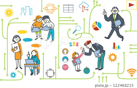 ICT教育とネットワークで繋がる人々 ITのシンボリックなアイコンのセットのストックイラスト素材