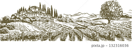 Tuscan Countryside Landscape Vintage Vector Illustration