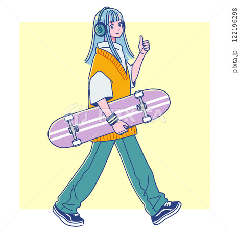 スケボーを持って歩く女の子