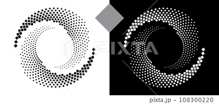 Spiral dotted background with squares. Yin and yang style. Design element or icon. Black shape on a white background and the same white shape on the black side.