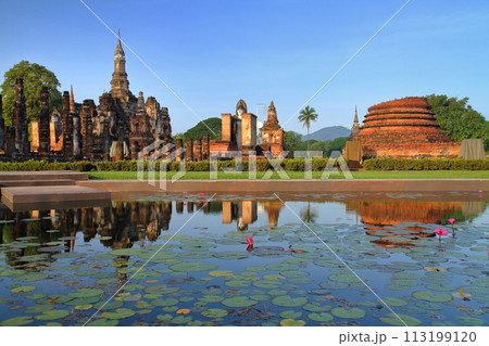 タイ北部の古都スコータイ 世界文化遺産のスコータイ歴史公園内のワットマハタート遺跡と池の水鏡と睡蓮