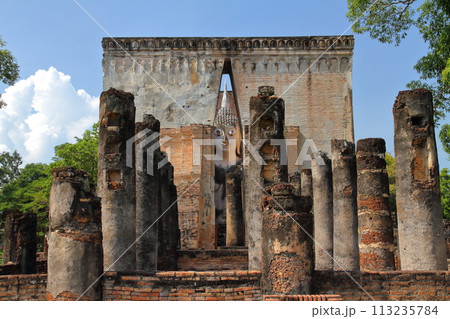 タイ北部の古都スコータイ 世界文化遺産スコータイ歴史公園のワットプラパーイルアン遺跡の仏塔や仏像