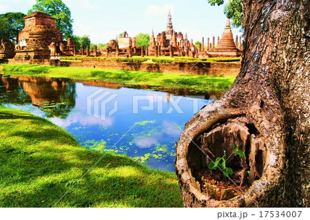 タイ北部の古都スコータイ 世界文化遺産のスコータイ歴史公園内のワットマハタート遺跡と堀の水鏡