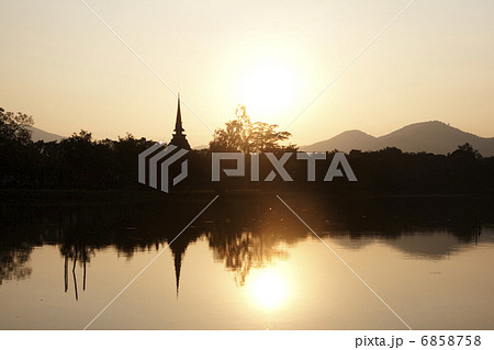 タイ北部の古都スコータイ 世界文化遺産スコータイ歴史公園のワットプラパーイルアン遺跡と池の水鏡