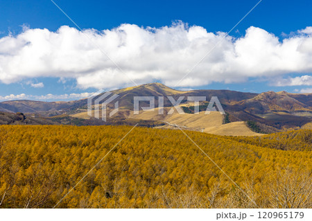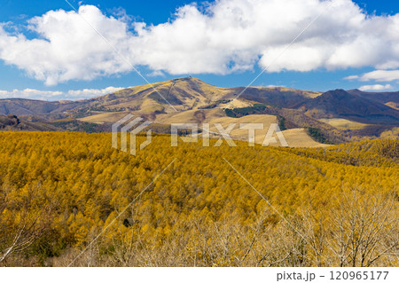 長野県北佐久郡立科町 ビーナスラインの白樺高原夕陽の丘公園からカラマツなどの紅葉の眺望