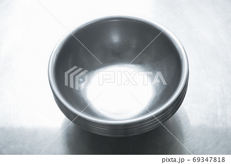 キッチンの調理台に置いたシルバーの調理用ボール/ボウル:料理・お菓子作り・下ごしらえイメージ素材