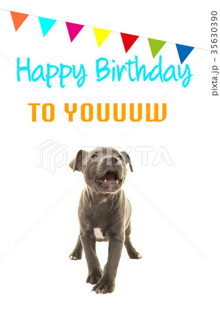 Cute happy birthday card with funny puppy Pit Bull. Loving American Staffordshire Pitbull Terrier