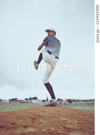 Man, baseball and pitcher in sports throw or competitive match to score point or win on the field outdoors. Professional baseball player in sport stance ready to pitch the ball in serious competition