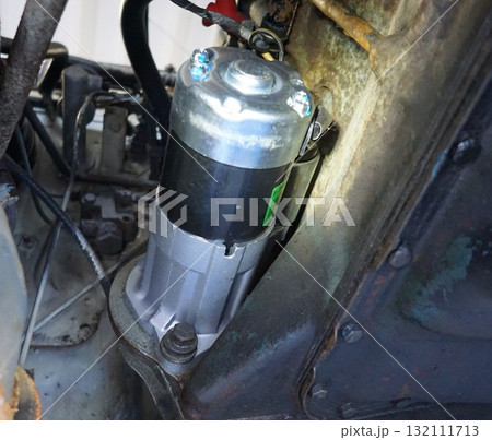 1974年式S30フェアレディZ整備 交換されたスターターモーター 整備中のS30フェアレディZ