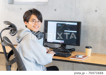 パソコンで作業をする若い男性 カメラ目線 ポートレート