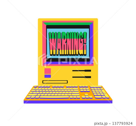 Vintage computer Y2K groovy sticker or funky tag. Digital technology funky vector patch, 1990s PC device Y2K label. Electronics hardware groovy sticker with warning text on retro PC computer monitor