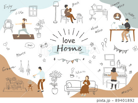 ステイホームで様々な活動をしている人たちのイメージイラスト素材