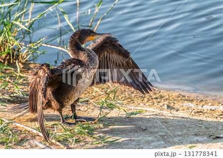 Great cormorant, Phalacrocorax carbo, sits on stone and dries its wings on the wind.