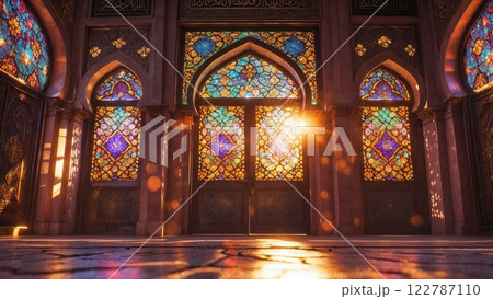Sunlight streams through stunning stained glass windows, casting colorful patterns on the floor. The intricate designs, rich colors, and sacred atmosphere evoke history and spirituality
