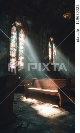 Abandoned church interior broken stained glass dusty wooden pews sunlight dramatic atmosphere