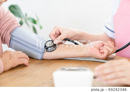 シニアの血圧を測る介護士