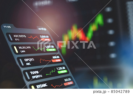 株式市場の電子ボードを背景にスマートフォン.