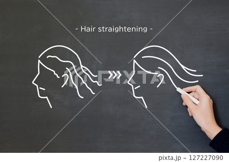 ストレートパーマの施術を受けた女性のイラストを黒板に描く人物の手