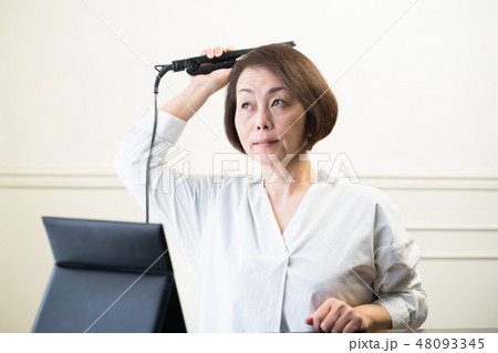 ヘアアイロンをしている女性