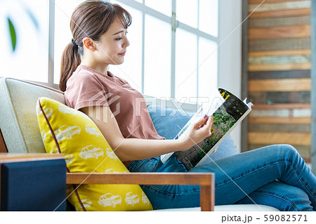 ヘッドフォンで音楽を聴きながらリラックスする若い女性