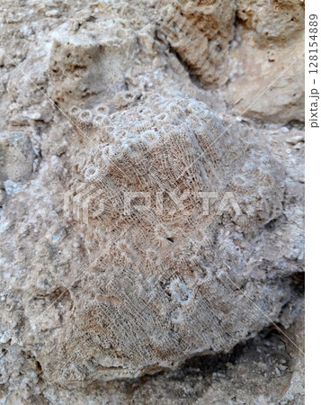 A detailed close up of an ancient fossil embedded in a rugged rock formation, showcasing intricate patterns and textures that hint at its prehistoric origins