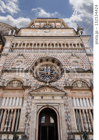 Facade of Colleoni Chapel in Bergamo with polychrome marble, statues and rose window