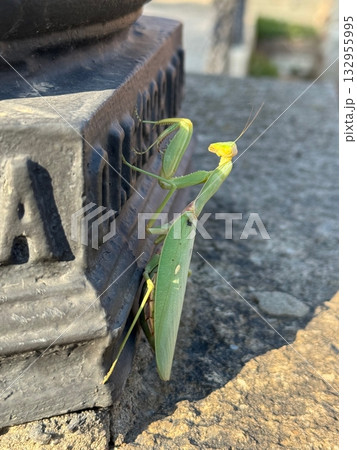 Green Praying Mantis Perched on an Old Stone Structure, Close-up view captured in an urban environment in Belgrade