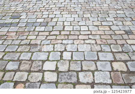 Granite cobblestone pavement. Ancient road surface. Stone sidewalk