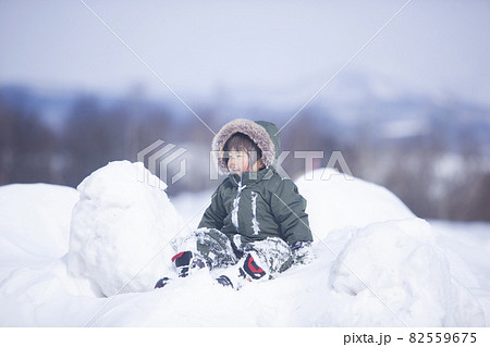 雪山に座る、3歳の男の子