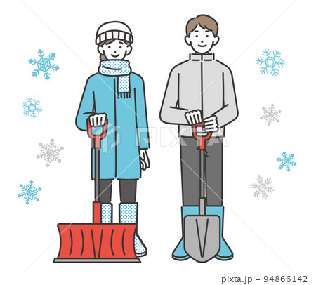 除雪をするためにスコップを持つ男女のベクターイラスト素材/雪/冬/雪国/シャベル