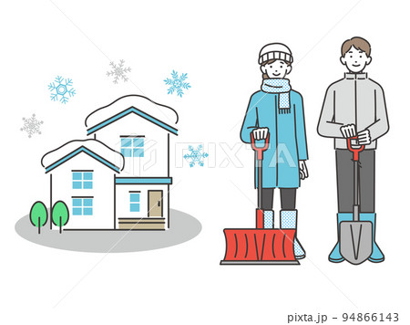 雪が積もった家と除雪をするためにスコップを持つ男女のベクターイラスト素材/雪/冬/雪国/シャベル