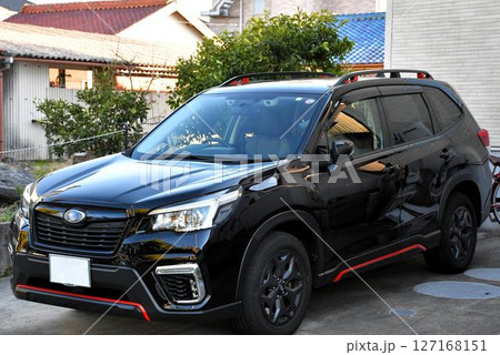 駐車場に停めた黒い車(スバル・フォレスター 5代目 )