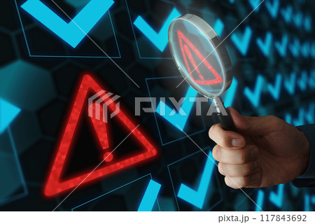 パソコンのセキュリティー警告。ノートパソコンを使う手のアップと警告マーク。